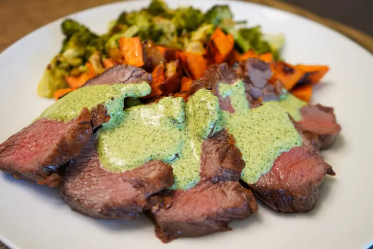 12. Plate and drizzle a healthy serving of Aji Verde sauce over the steak.
